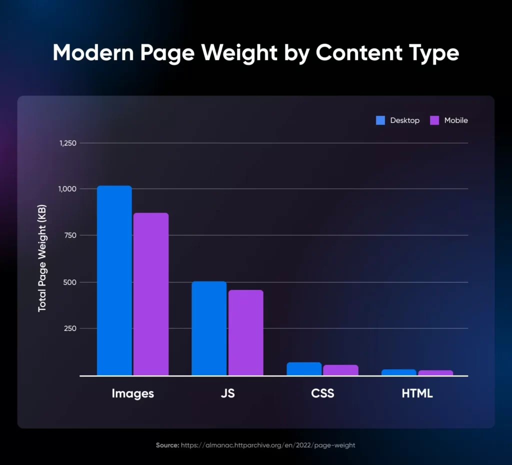 图片对网站页面体积的影响很大,在 2315 KB 的总体积中,桌面图片的平均体积超过 1000 KB。这相当于近 50%!
