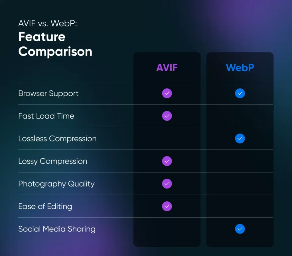 WebP 适用于大多数网站,能轻松处理照片、插图、Logo 和动画。WebP 支持广泛,是在网络上快速加载高质量图像的可靠选择。