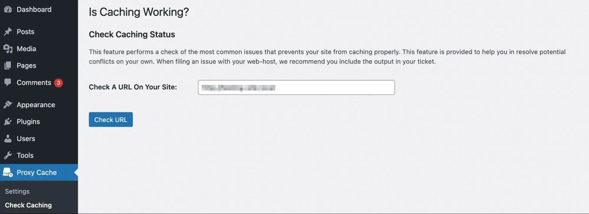 这个缓存插件是一个可以用来管理缓存的工具。打开“Check Caching”页面,输入网站或特定页面的 URL 即可:
