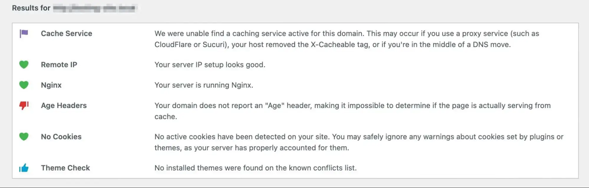 然后,点击 Check URL 查看缓存问题报告。您还可以查看有关活动 cookies 以及任何主题冲突的信息: