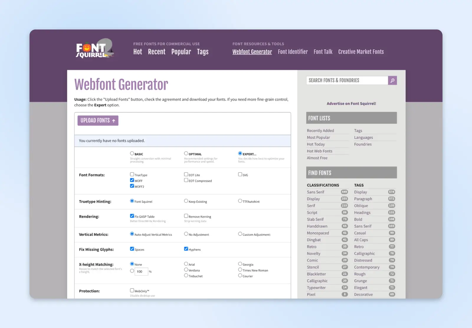 如果你更喜欢基于图形用户界面的方法,也可以试试 font-squirrel。一旦上传了字体文件,你就可以获得大量的自定义选项来添加或删除字体。