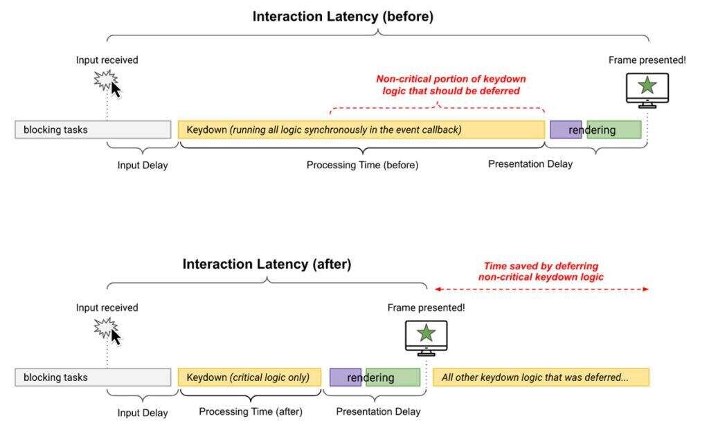 - 输入延迟:这一阶段主要受 JavaScript 中所谓的长任务影响。如果用户交互发生时浏览器已处于繁忙状态,它就必须在处理交互之前完成任务,从而导致明显的延迟。