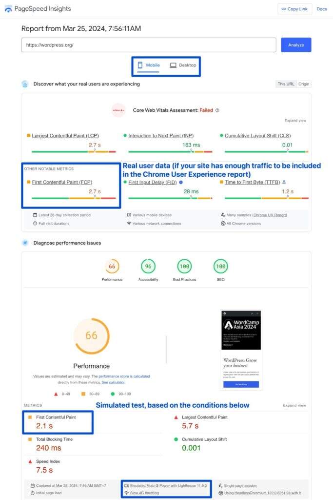 它还涵盖桌面和移动性能,因为页面的 FCP 时间会因用户的设备和连接速度而异。