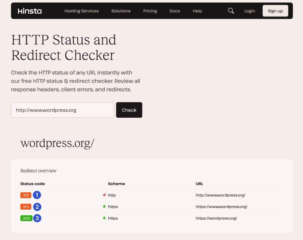 要查找重定向问题,可以使用免费的重定向检查工具。我们还有一篇关于 WordPress 重定向最佳实践的文章。