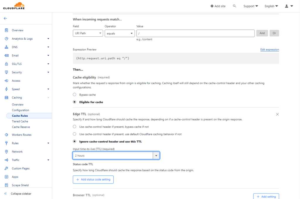 - 第 4 步:将 Edge TTL 设置为适合网站的值。如果要手动设置,请单击Ignore cache-control header and use this TTL(忽略 cache-control 标头并使用此 TTL)。
