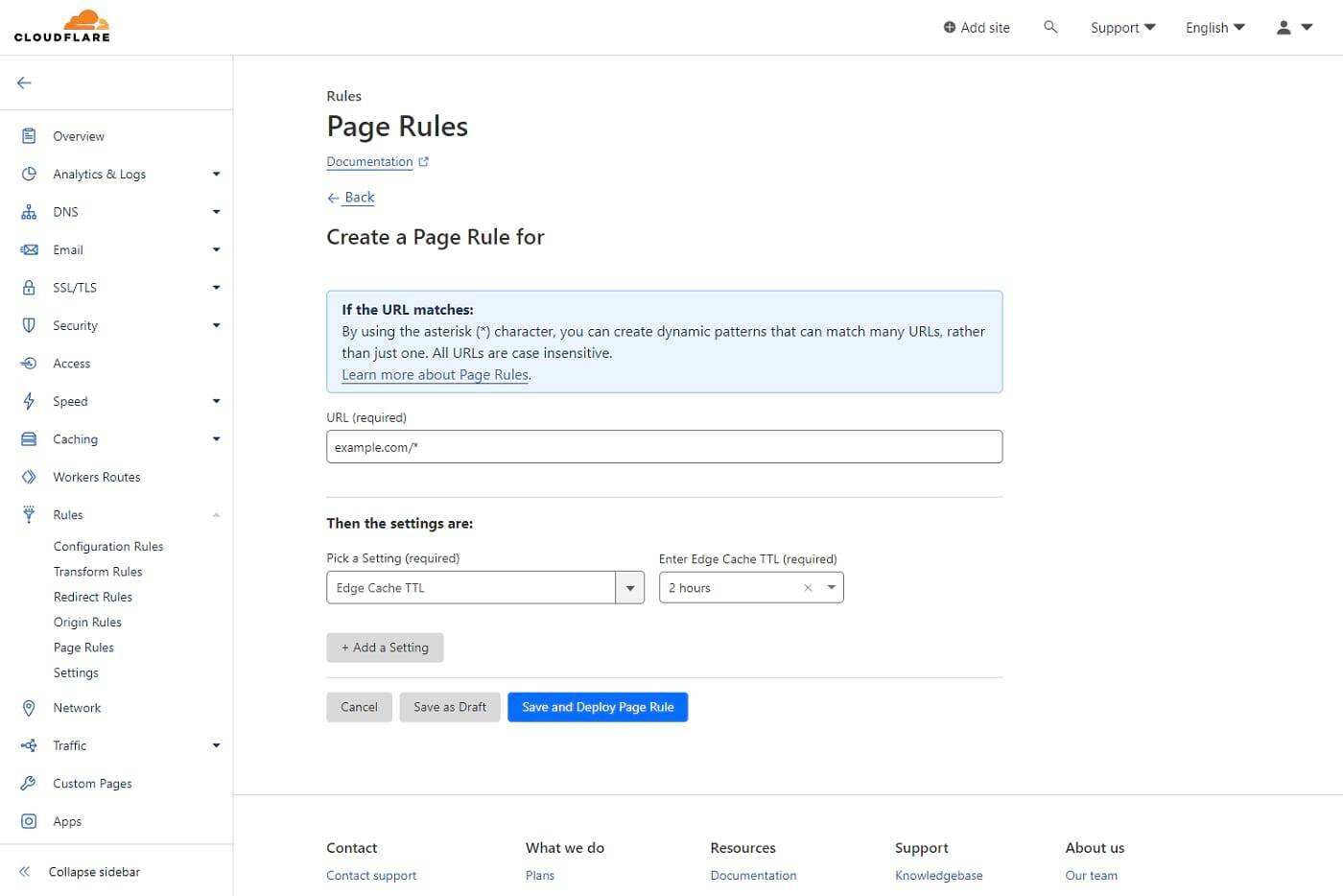 - 第 3 步:在 URL(必填)字段中输入要进行边缘缓存的页面。使用通配符 (*) 将此设置应用于多个页面。例如,”example.com/*” 将适用于网站上的所有页面。请注意,并非所有页面都适合缓存。