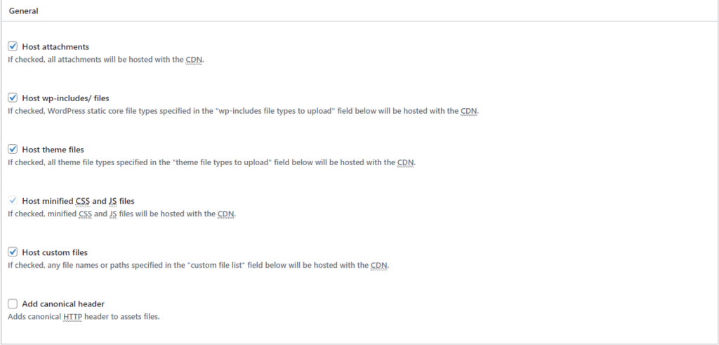 - 确认 General 部分中的以下选项已启用:  - Host attachments: 将所有 WordPress 网站附件缓存到 Vultr CDN。