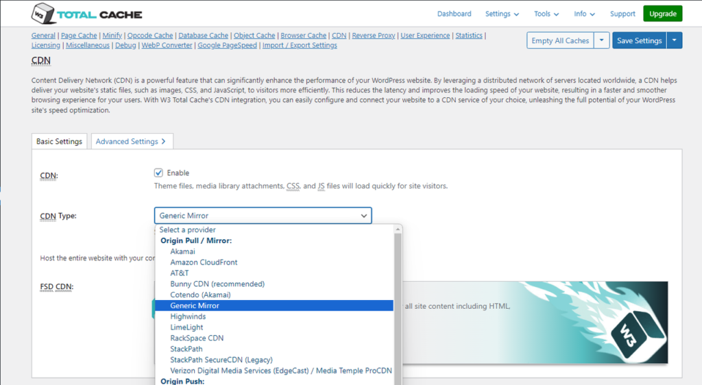 - 单击 CDN Type 下拉菜单,从 CDN 选项列表中选择 Generic Mirror。