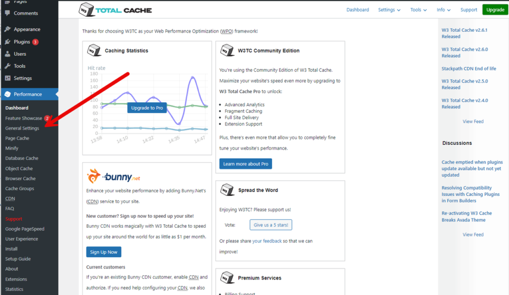 - 在主导航菜单中找到并单击 “Performance“,进入 W3 Total Cache 配置页面。
