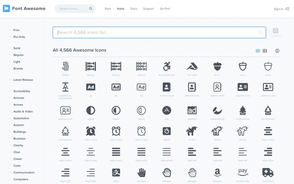 现在有很多为 WordPress 网站查找图标字体的好地方。只需在谷歌中输入 “图标字体”,就能找到一些不错的结果。其中最受欢迎、使用最广泛的是 Font Awesome(或者阿里巴巴旗下的 icofont )。截至撰写本文时,Font Awesome 有 1,400 多个免费图标,专业版中还有 4,500 多个图标。从界面图标到社交图标、箭头图标以及许多其他类型的图标,它几乎无所不包。
