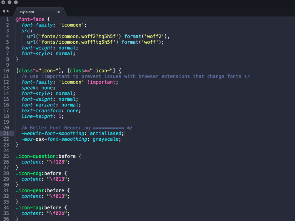 如果你查看一下 CSS 文件,就能知道后台正在发生什么。字体文件已加载,.fa 类的基本元素已定义(还有一些其他元素),最后,每个命名图标已定义(例如:.fa-book)。