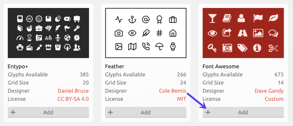 前往 IcoMoon 生成器。在 Font Awesome 库中点击 “Add”。