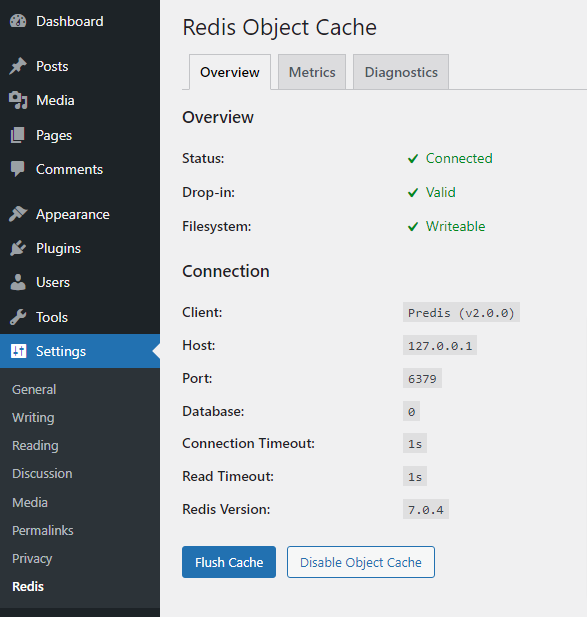 在 WordPress 面板中导航至设置 > Redis。您应该会看到类似下面的内容: