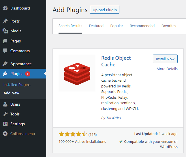 例如,让我们在本地 WordPress 网站上安装 Redis Object Cache 插件。