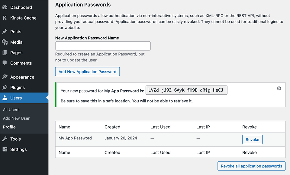 在WordPress控制面板的用户个人资料页面上生成应用程序密码。您可以为每个应用程序密码指定一个用户友好的名称,但在生成密码后,您将无法查看密码本身(所以现在就复制一份):