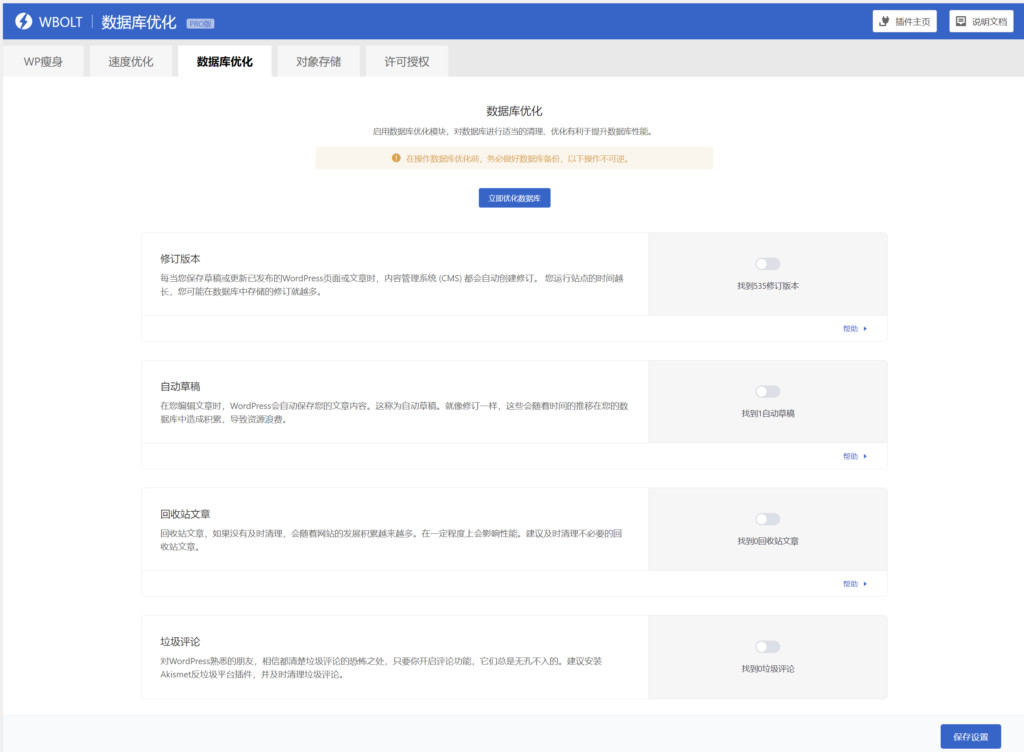 再者,WPTurbo 并非单纯的数据库优化插件,除了数据库优化之外,还能够实现 WordPress 瘦身、速度优化和对象存储等功能,多策略组合的形式来实现 WordPress 性能优化。