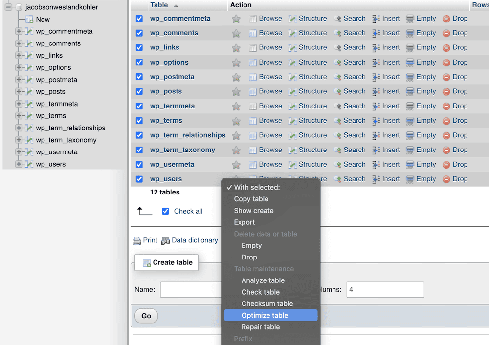 在很多情况下,你已经进入了 WordPress 网站的数据库。无论如何,您都会看到数据库中的表列表。只需批量选择所有表,然后从下拉菜单中选择 “Optimize table” 选项,再点击 “Go“: