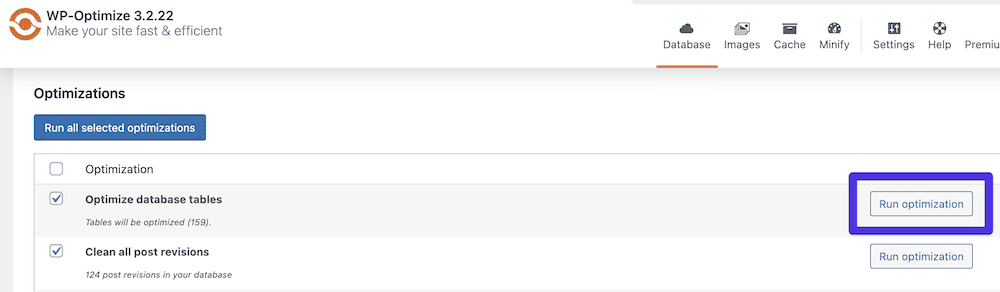 使用 WP-Optimize,前往 WP-Optimize > Database > Optimizations。在这里,点击优化数据库表选项旁边的运行优化按钮:
