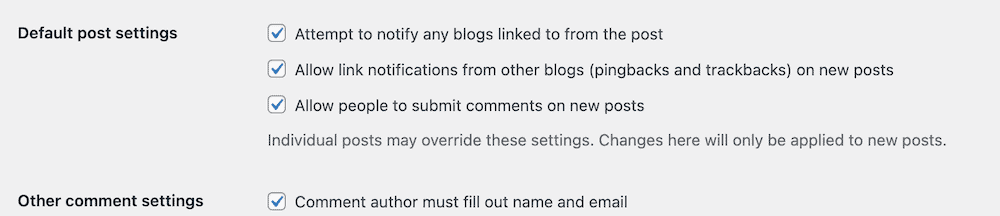 我们不清楚在当今时代有多少 WordPress 网站使用 pingback 和 trackback,但如果你不关闭设置,它们仍然会扰乱你的数据库。首要任务是检查是否已禁用该选项。这在 WordPress 的 “Settings“>”Discussion” 屏幕中是一项简单的工作:
