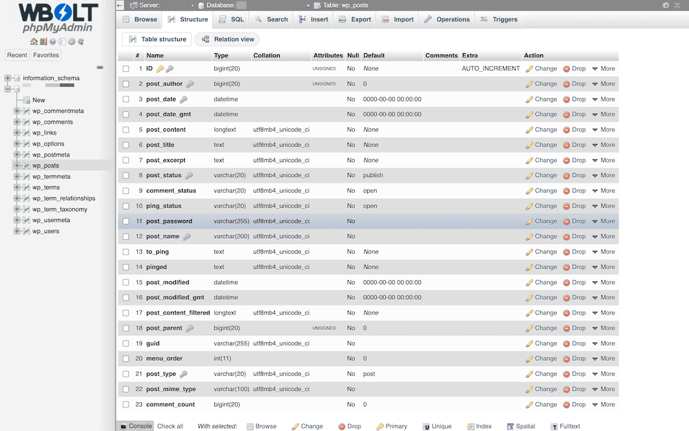 例如, wp_posts 表包含帖子和页面,而 wp_users 则保存网站用户的数据。稍后我们将详细介绍其中的一些表。