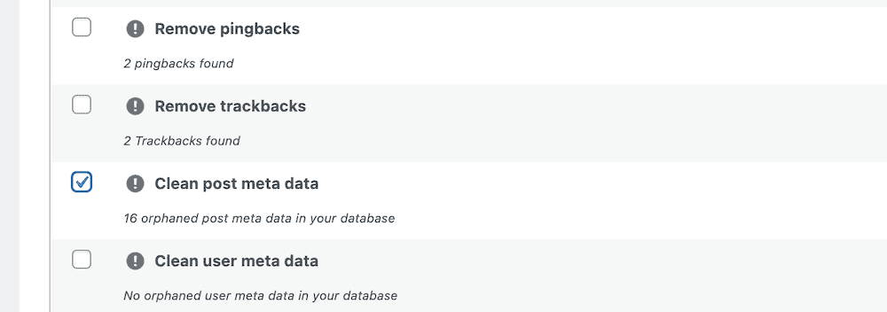 在 WP-Optimize 中移除未使用标记的最近选项是 Clean post meta data。该功能会评估是否有任何孤儿元数据,并将其删除: