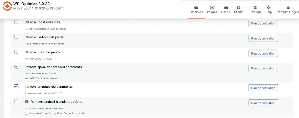 在 WP-Optimize 中,有三个选项可以帮助您删除垃圾评论和 WordPress 垃圾箱: