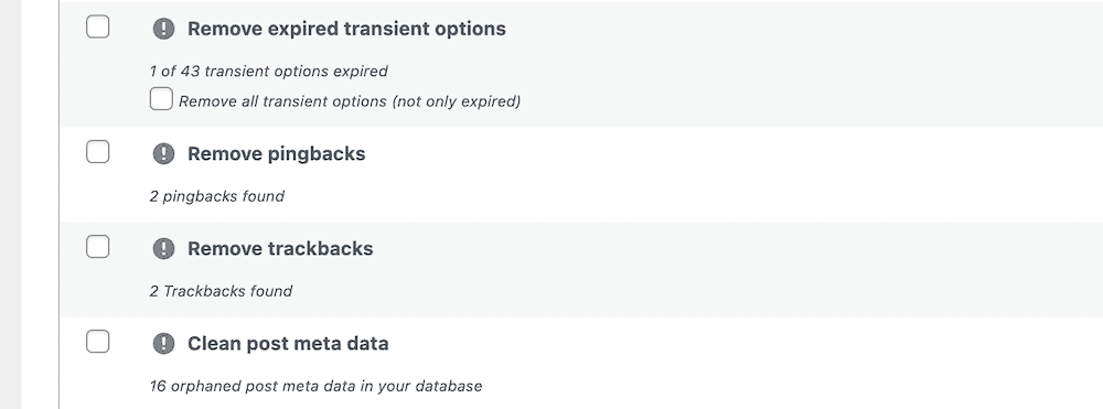 - 提高网站速度和性能。随着时间的推移,您的 WordPress 数据库会包含一些不必要或冗余的数据,例如瞬时选项、文章修订版本、垃圾评论或过时的草稿。这种臃肿会降低信息检索速度。