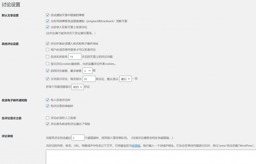 - 要审核来自新评论者的评论,请选中评论作者先前须有评论通过了审核。