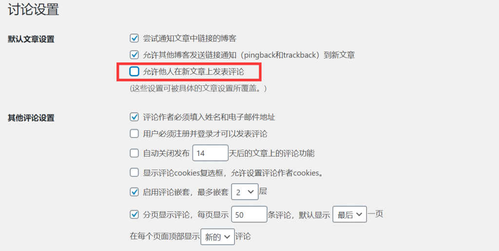 这是最懒人的一种办法。或许你的网站根本不需要使用到评论功能,为了保护自己免受垃圾评论的骚扰,干脆禁用它们。最简单的方法之一就是取消选中“ 设置”>“讨论”下的“ 允许他人在新文章上发表评论”选项。如下图所示: