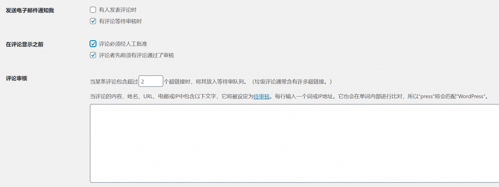 在“ 评论审核”部分中,设置需要进行评论审核的评论链接数量。要允许一个链接,请使用2,或者要任何带有链接的评论都需要审核,请选择1。