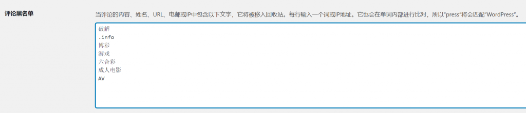 要创建列入黑名单的单词列表,请转到“ 评论黑名单 ”字段,然后输入列入黑名单的单词或短语,每行输入一个。它们不必局限于单词:它们可以包含电子邮件地址,网站URL,IP地址或您想要包含的任何内容。