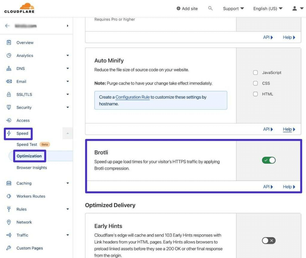 如果你使用Cloudflare为你的网站内容提供服务,Cloudflare也有一个内置设置来启用Brotli压缩: