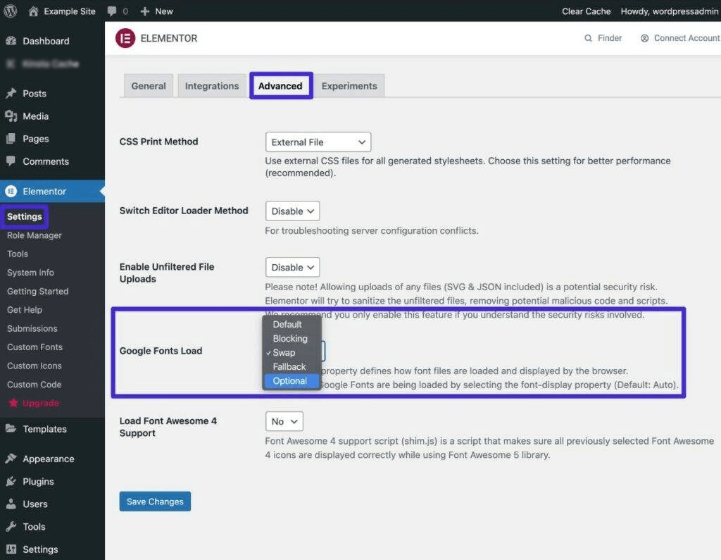 如果你愿意直接使用CSS,你可以在你的子主题的样式表中手动编辑Font-Display属性。