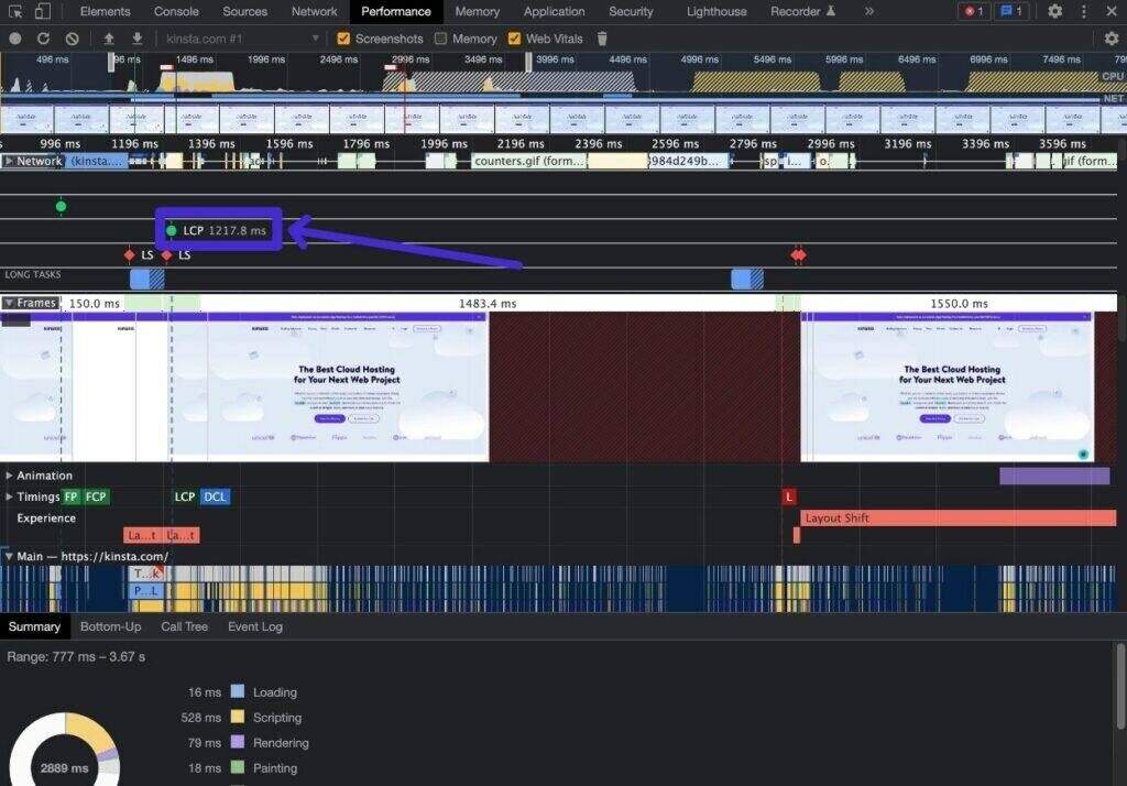 你也可以直接从Chrome开发者工具中使用性能选项卡或其Lighthouse审计功能来测试Largest Contentful Paint时间。我们建议使用 “Performance” 选项卡,因为它能为你提供更多信息。