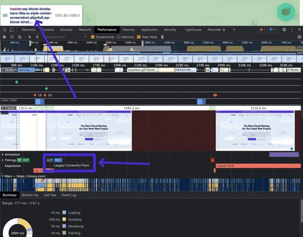如果你把鼠标悬停在Timings标签的LCP上,你可以看到实际的LCP元素: