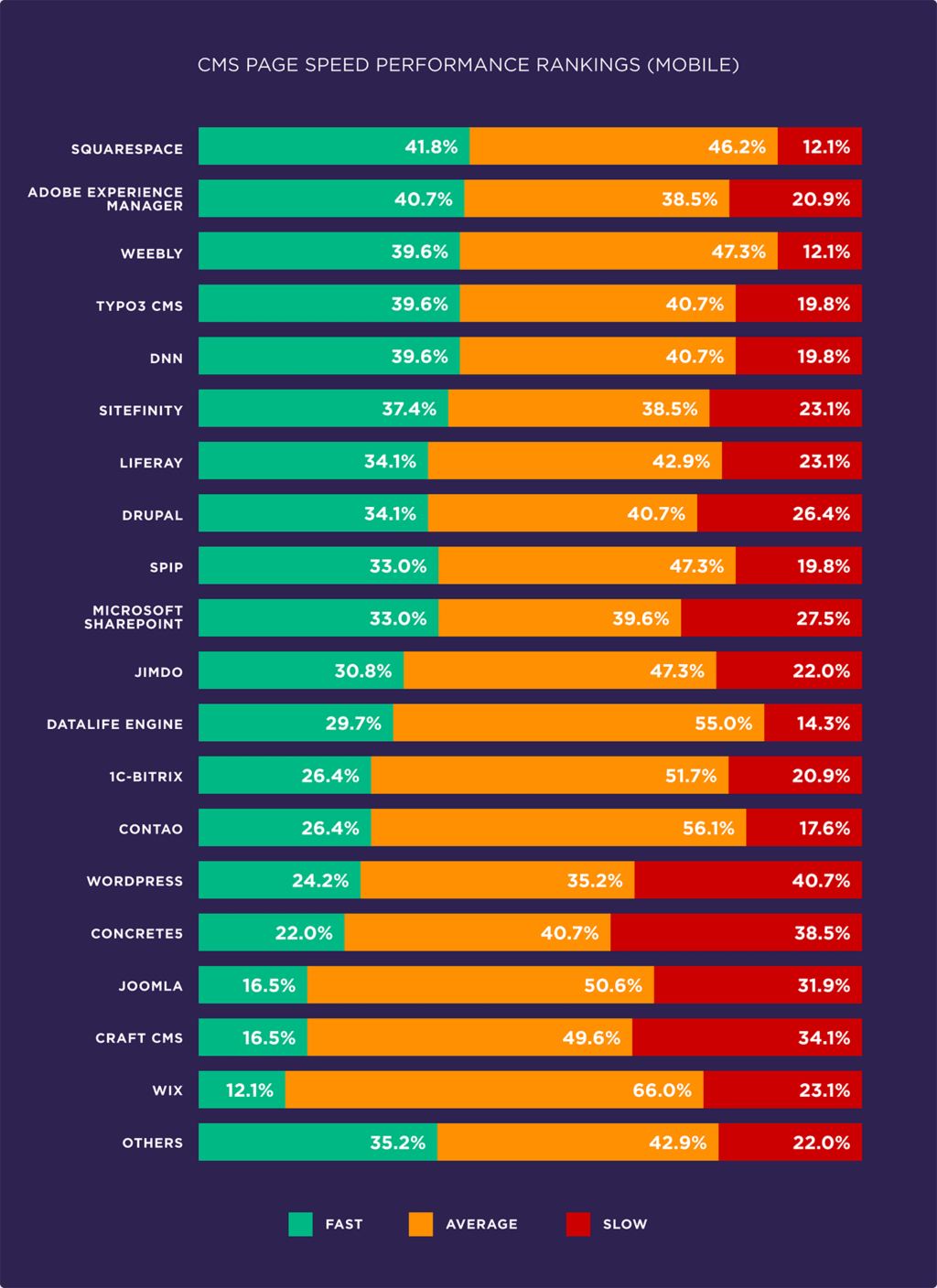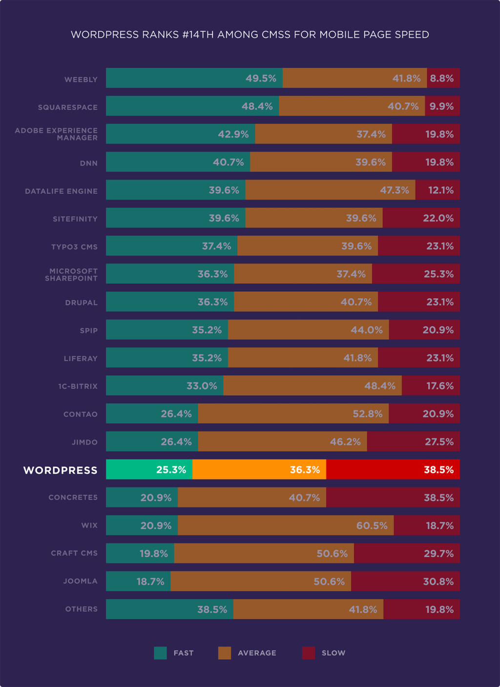 值得注意的是,在移动速度方面,WordPress仅排在我们分析的CMS第14位。