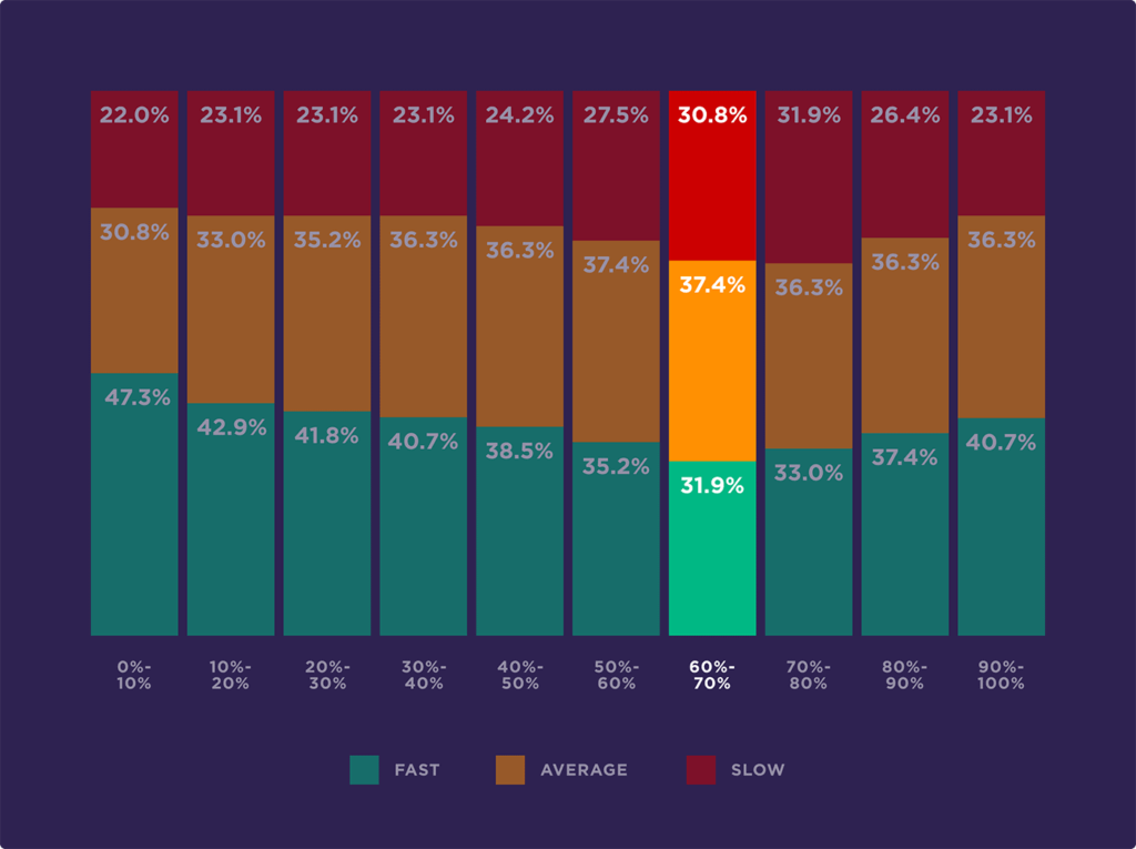 具体来说,我们将TTFB分为三类(快速、平均、慢速)。我们查看了每个主机出现在每个类别中的百分比。