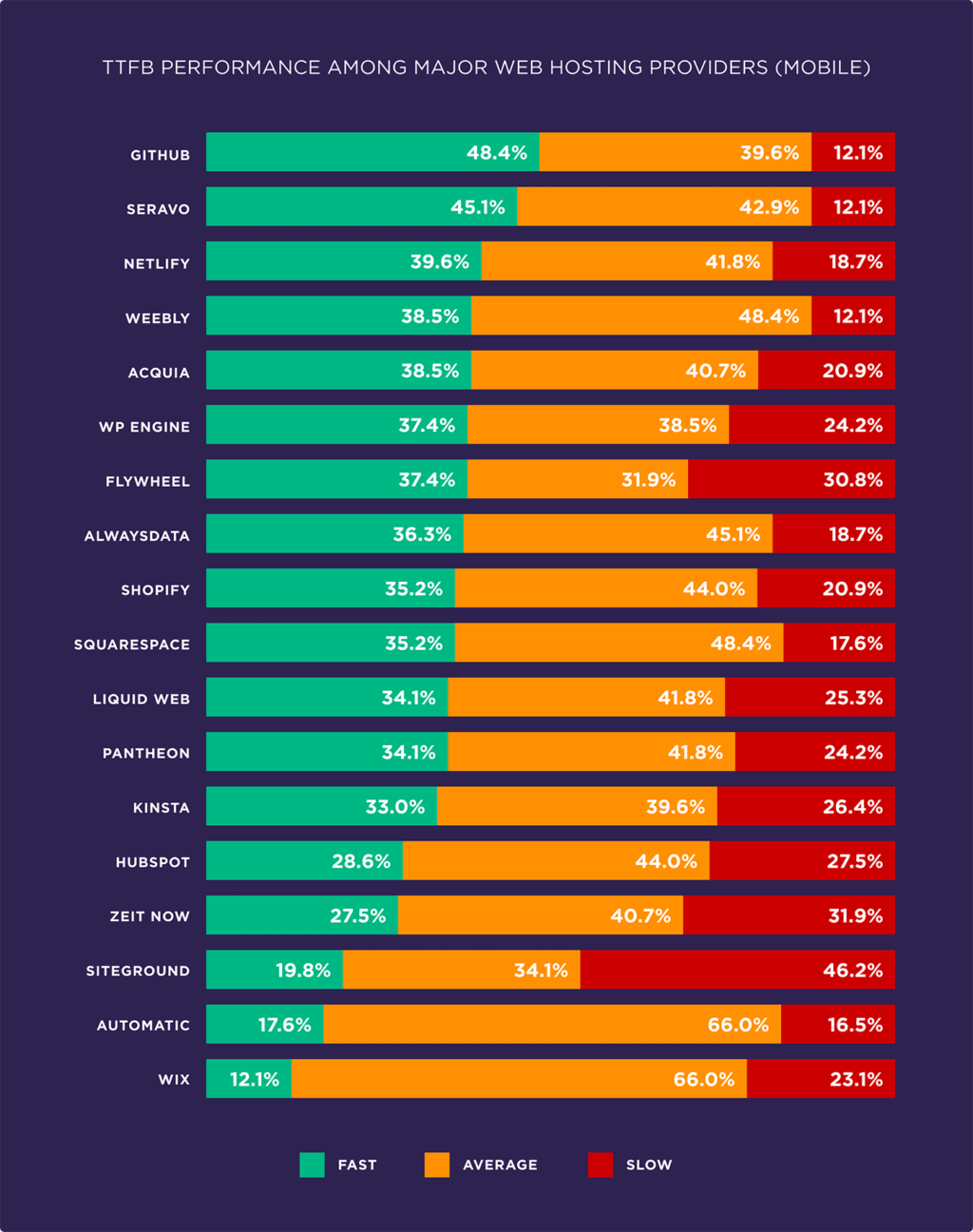 11. GitHub和Weebly网络主机具有最快的整体TTFB性能。在我们分析的托管服务提供商中,Siteground和Wix是最慢的。