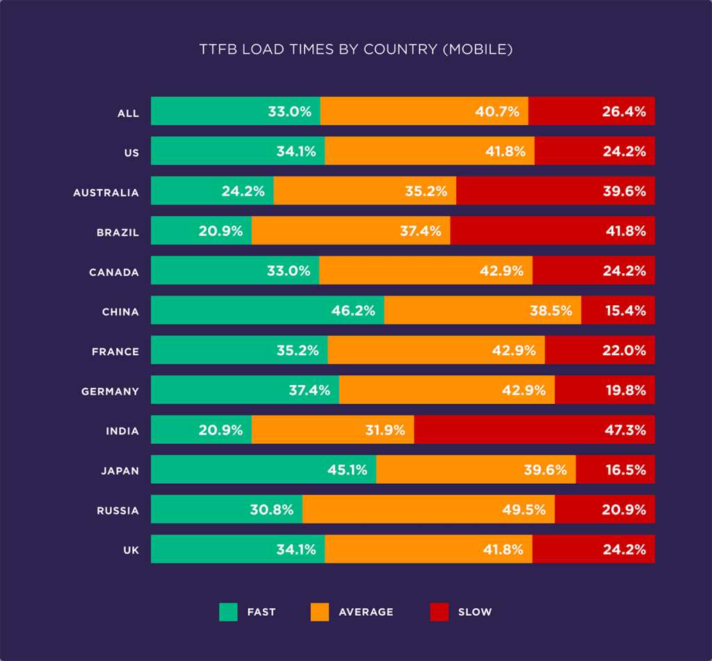12. 中国、日本和德国的TTFB加载时间最快。澳大利亚、印度和巴西的TTFB时间最慢。