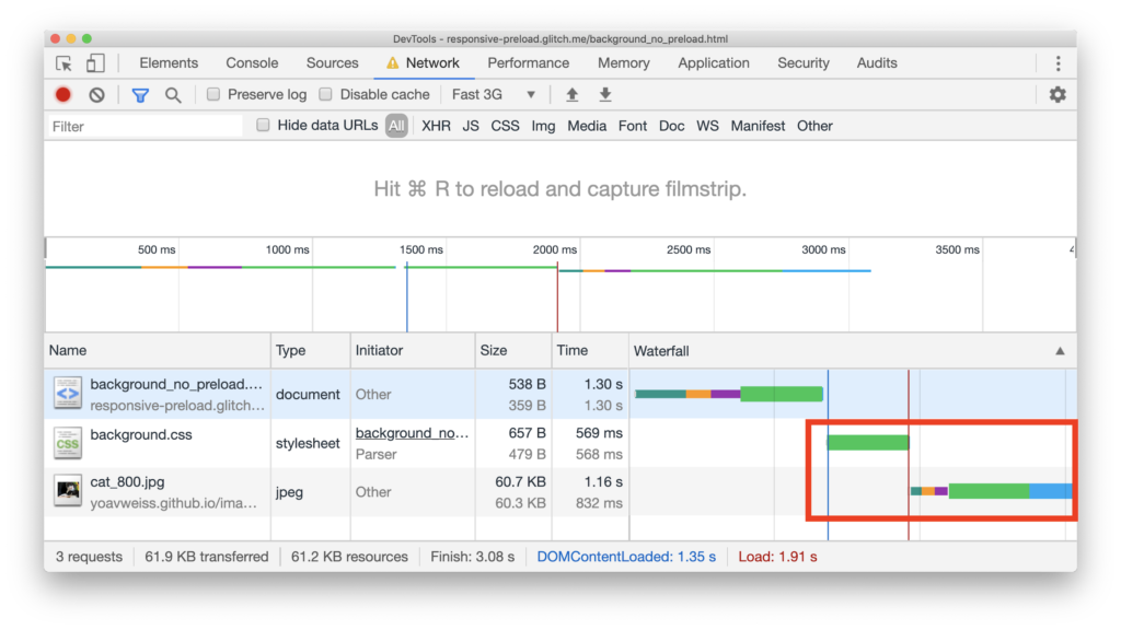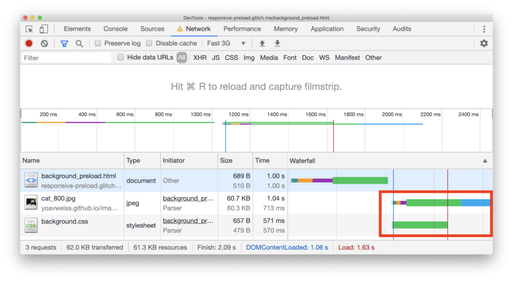 在这里,图像和CSS同时开始下载,避免了延迟,从而加快了图像的加载速度。