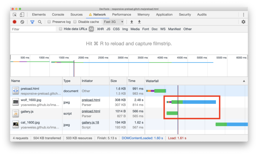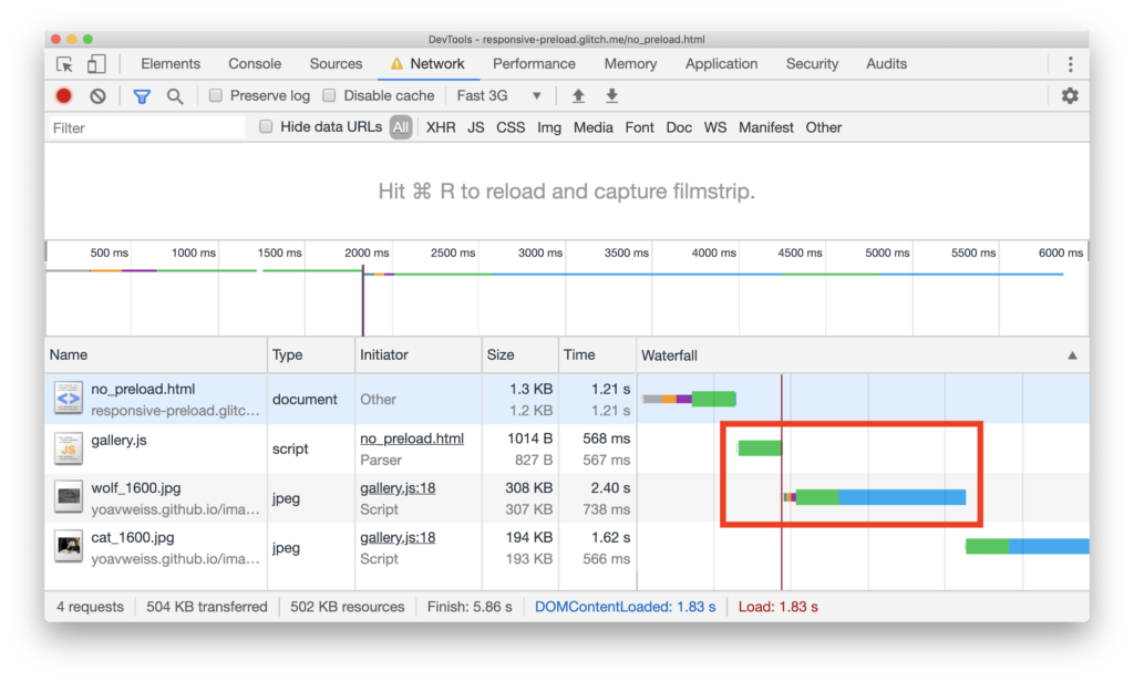 响应式图像和预加载在过去几年中一直可用,但同时缺少一些东西:无法预加载响应式图像。从Chrome 73开始,浏览器可以在发现标签img之前预加载srcset指定的响应图像的正确变体!