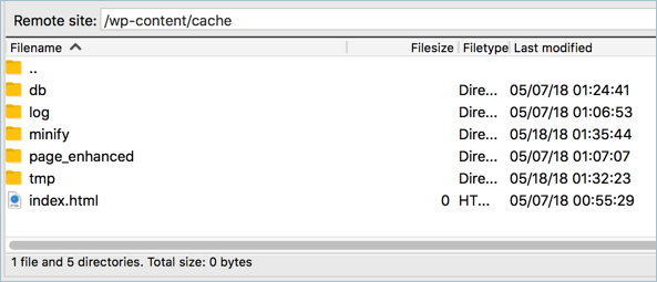 W3TC将在“/wp-content/”下创建一个“Cache”文件夹,并存储您网站的所有缓存内容。此处的内容取决于启用的设置。每种启用的缓存类型都会在此处创建一个目录。例如,启用页面缓存、数据库缓存和对象缓存将创建三个不同的文件夹并分别存储内容。