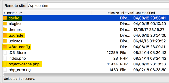 W3TC在“/wp-content/”文件夹下创建了许多其他目录,如下所示。您应该删除所有这些目录和子目录以进行清理。我们将在本文的其他部分对此进行解释。