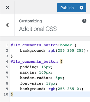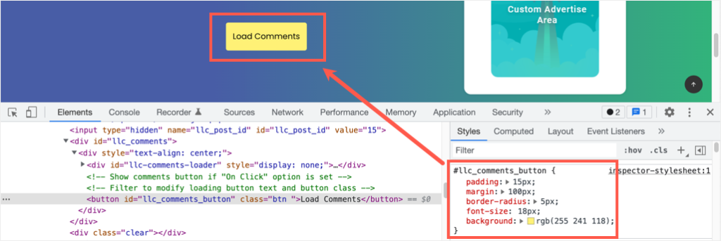如果您的主题没有正确显示“Load Comments”按钮,您需要使用自定义CSS调整填充和边距细节。该插件使用llc_comments_button的CSS类ID来定义按钮样式。例如,下面是我们用来对齐breek主题上的按钮的CSS代码。