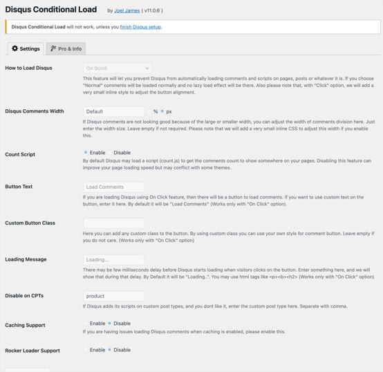 Disqus Conditional Load插件需要在延迟加载之前完全集成Disqus。它将在仪表盘侧边栏中创建名为“Disqus”的附加菜单项。您可以浏览不同的部分并自定义设置以延迟加载Disqus评论。