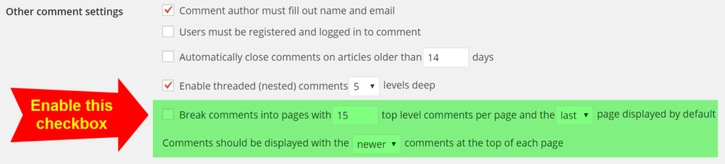 WordPress 在“设置 > 讨论”部分提供了一些默认设置来管理评论。例如,您可以设置在博客文章中显示的最大评论数。当评论数量超过设置限制时,这将创建分页评论。但是,它并没有提高多少速度,因为评论表单将在初始页面加载期间加载。
