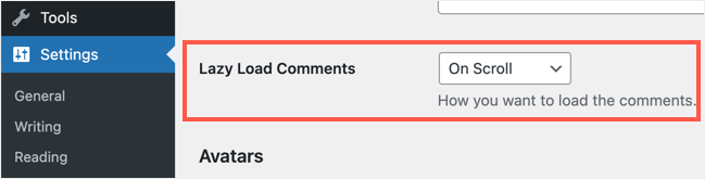 该插件提供了一种简单的设置来决定您希望如何延迟加载评论部分。转到“设置 > 讨论”部分并向下滚动到底部。在“头像”部分上方,您可以找到“Lazy Load Comments”的新选项。