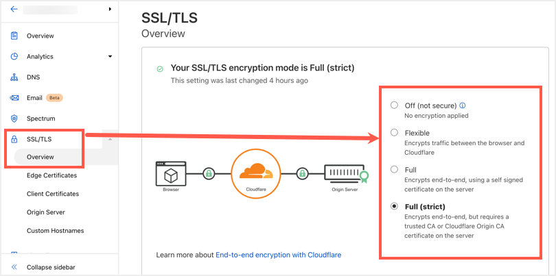 相对协议选项会将所有静态文件(如图像)的URL更改为使用//而不是http://或https://。WP Rocket建议仅在Cloudflare中的SSL状态设置为灵活时才使用此选项。您可以在Cloudflare帐户仪表盘的“SSL/TLS > Overview”部分下查看SSL/TLS状态。