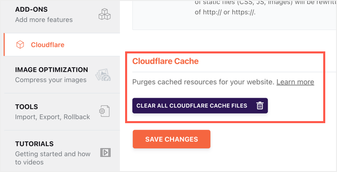 这是最终设置,只有当您想要删除Cloudflare缓存的内容时,才可以单击“CLEAR ALL Cloudflare CACHE FILES”。这与Cloudflare帐户的“Caching > Configuration”部分下的“Purge Everything”选项相同。