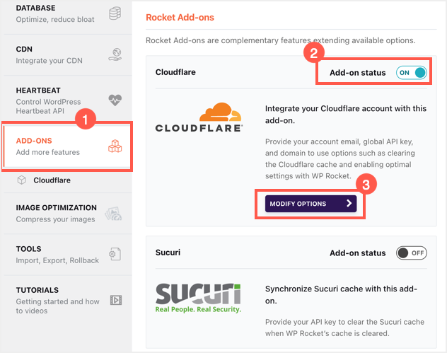 登录到您的WordPress管理面板并导航到“Setting > WP Rocket”部分。导航到“附加组件”菜单并向下滚动到“Rocket Add-ons”部分。此时,WP Rocket提供了两个附加组件——Cloudflare和Sucuri。默认情况下,所有加载项状态都设置为关闭。通过单击“Add-ons status”按钮打开Cloudflare加载项,如下所示。
